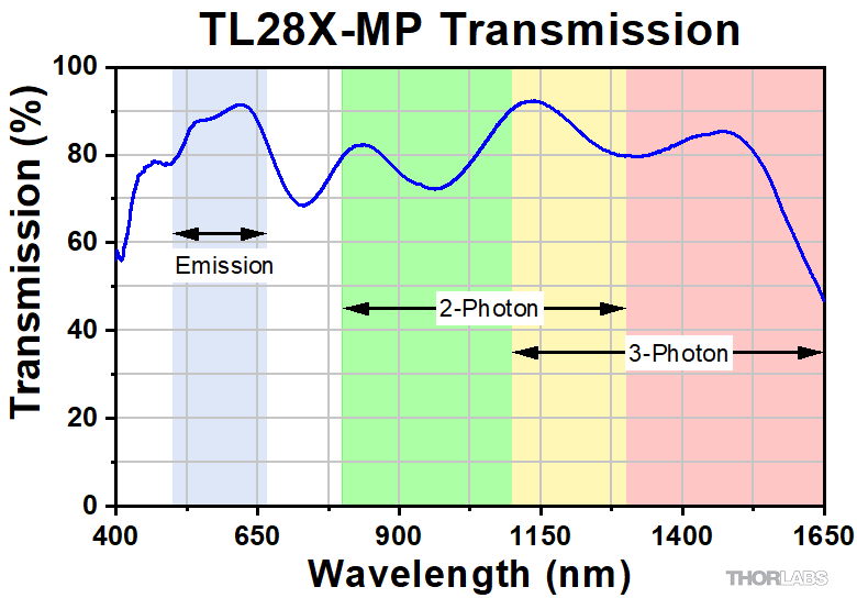 The TL10X-2P Super Apochromatic and TL15X-2P Plan Apochromatic Improved Visible (APO VIS+) Objectives combine the diffraction limited axial color performance at visible wavelengths of our other objectives with excellent transmission out to 1300 nm, making these objectives ideal for multiphoton imaging applications (see the Graphs tab for details). The TL28X-MP Plan Apochromatic objective is optimized in the NIR, with diffraction limited performance from 900 -1650 nm, making it another great choice for multiphoton microscopy, including with 3-photon excitation. For more information about how these objective classes are defined, see the Objective Tutorial tab.
