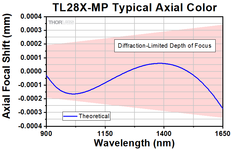 Axial color describes the shift in the image plane across the operating wavelength range of the 1X super apochromatic microscope objective. The pink shaded region denotes diffraction-limited performance.